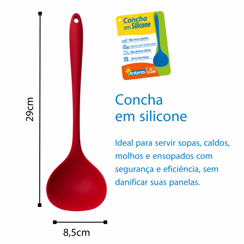 A concha de silicone, resistente ao calor e livre de BPA, é ideal para servir sopas, caldos, molhos e ensopados com segurança e eficiência, sem danificar suas panelas.