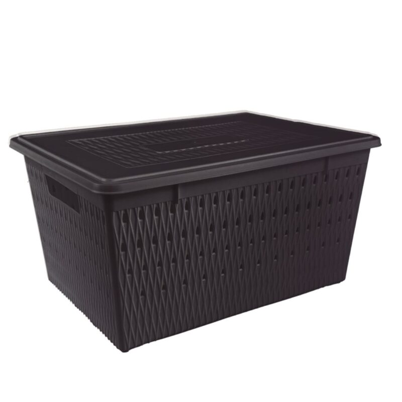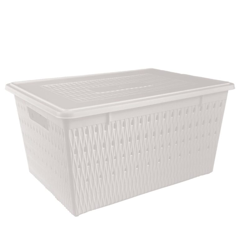 A tampa firme protege contra poeira. O design vazado permite circulação de ar, ideal para lavanderias e áreas de serviço.