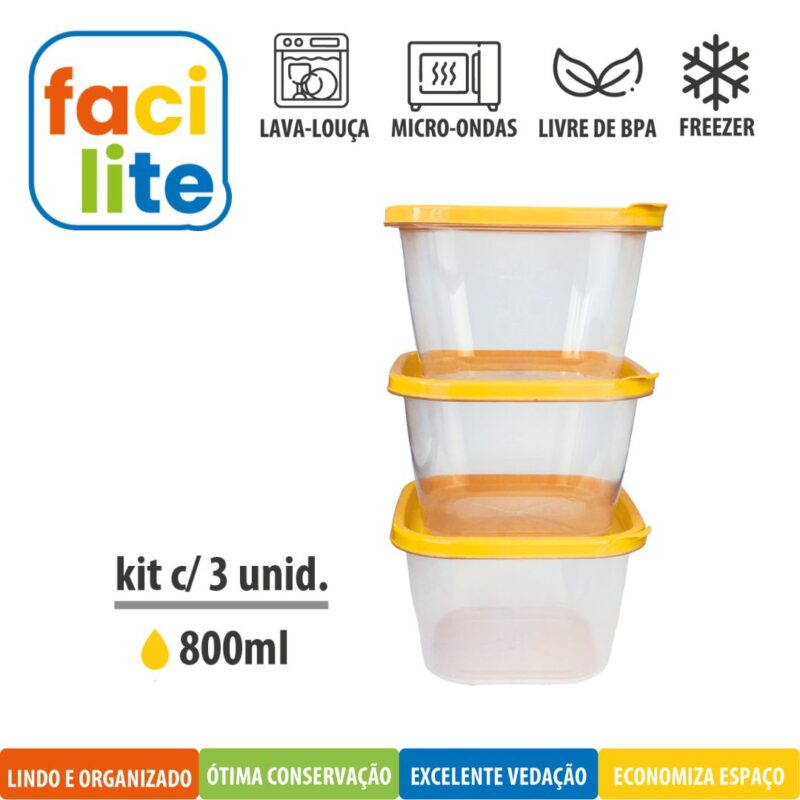 Kit Facilite de Potes Quadradros com 3 UNID de 800ml